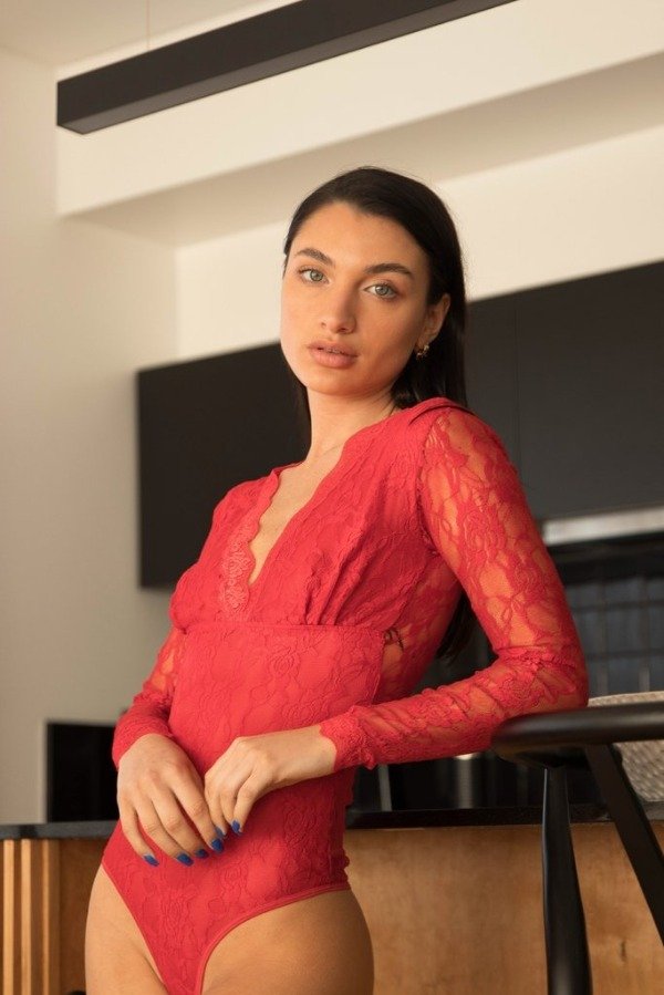 Body de encaje con detalles de puntilla, mangas largas delantero forrado con tul piel.